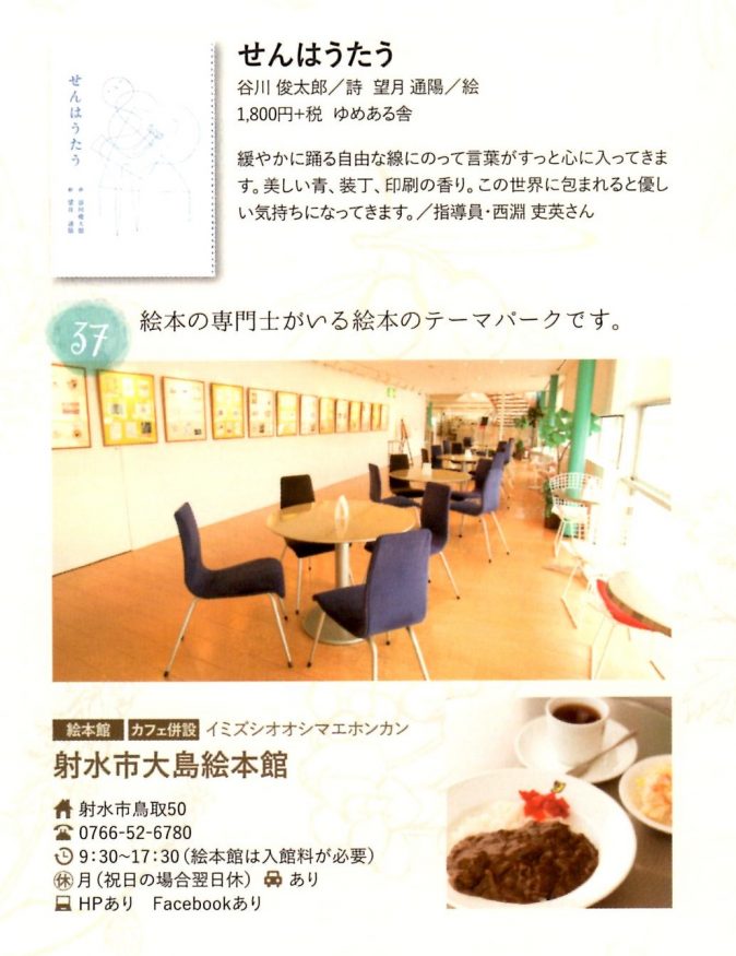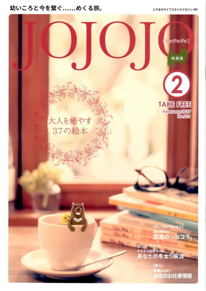 とやまのライフスタイルマガジン「JOJOJO」の2月号は、「大人を癒す37の絵本」を紹介しています。射水市大島絵本館の指導員の方の推薦で『せんはうたう』が、紹介していただいております。『せんはうたう』は、富山の印刷所で作られているんです。ご縁を感じてとても嬉しいです。