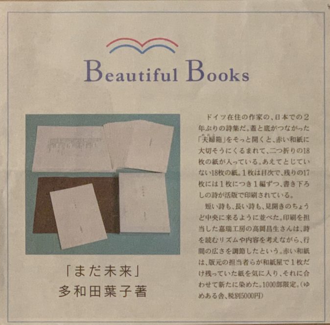 4月12日(日)の日経新聞「Beautiful Books」に、多和田葉子詩集『まだ未来』が掲載されました。写真がカラーで、嬉しいです。